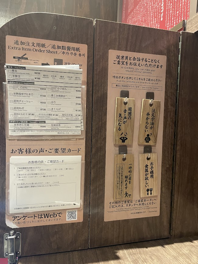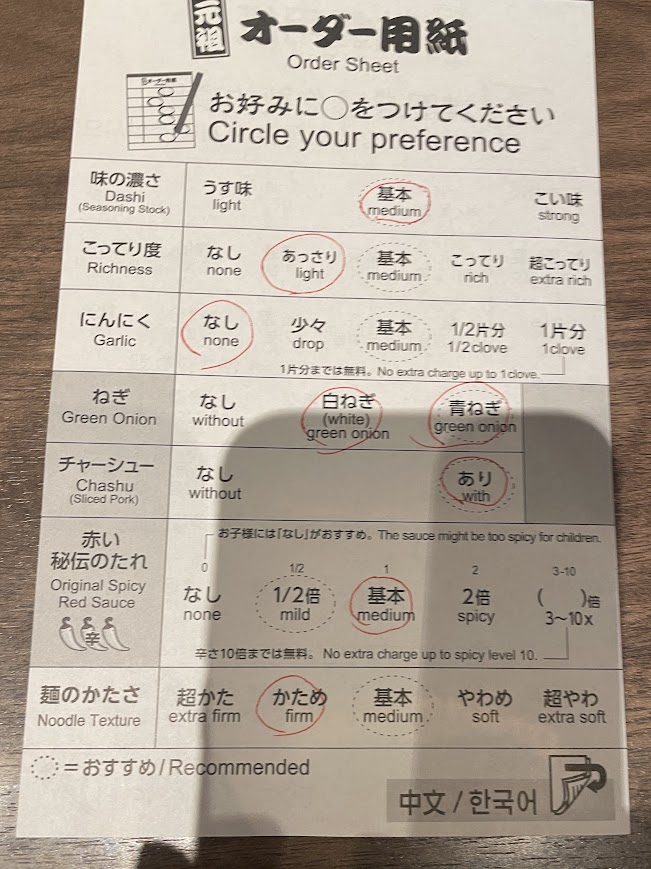 Here comes the fun part—the order sheet! You can customize your ramen just the way you like it, from the richness of the broth to the firmness of the noodles and even the spiciness level. It’s both exciting and a little overwhelming to decide. Thankfully, there are options in both Japanese and English, making it easy for everyone to create their perfect bowl.