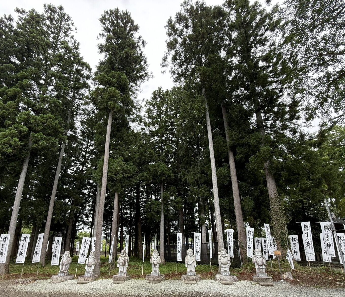 Stone statues of the Seven Lucky Gods stand together at the back of the shrine grounds—set against a backdrop of tall cedars, it felt like a divine meeting in progress! I soaked up all the good fortune in the peaceful air.