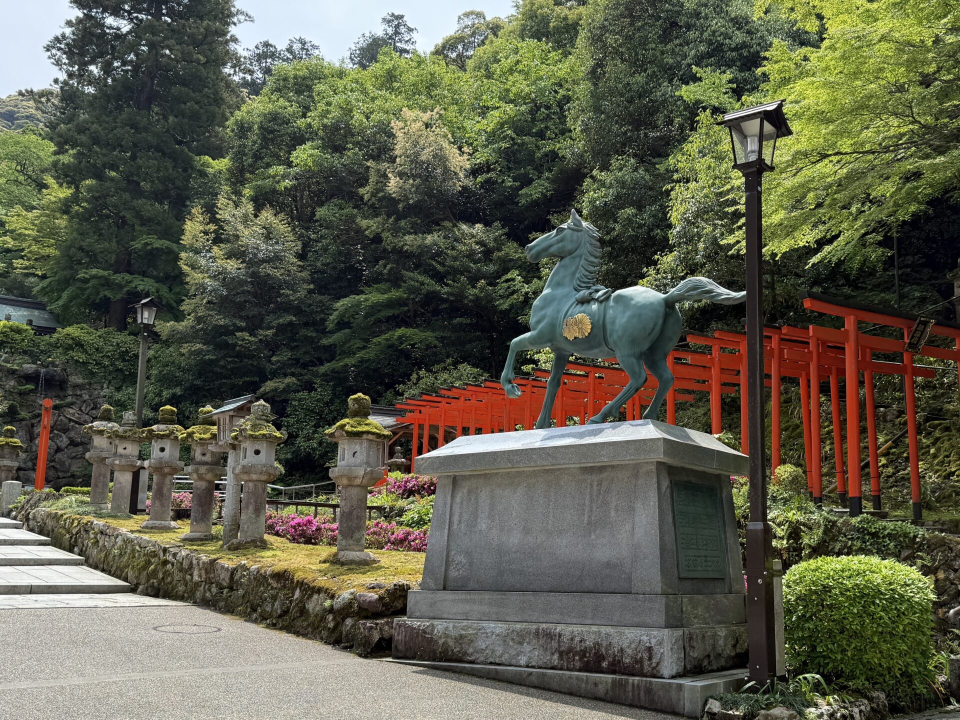 The approach to the shrine is lined with vibrant red torii gates, creating a stunning scene—especially with the sacred horse (shinme), believed to be the deity’s steed, adding that perfect photo-worthy touch!