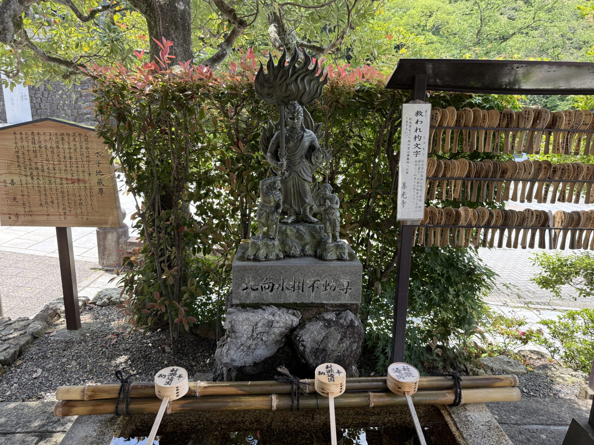 Standing quietly behind the purification fountain is the Kitamuki Mizukake Fudō-son (North-facing Water-Splashing Fudō Myōō).