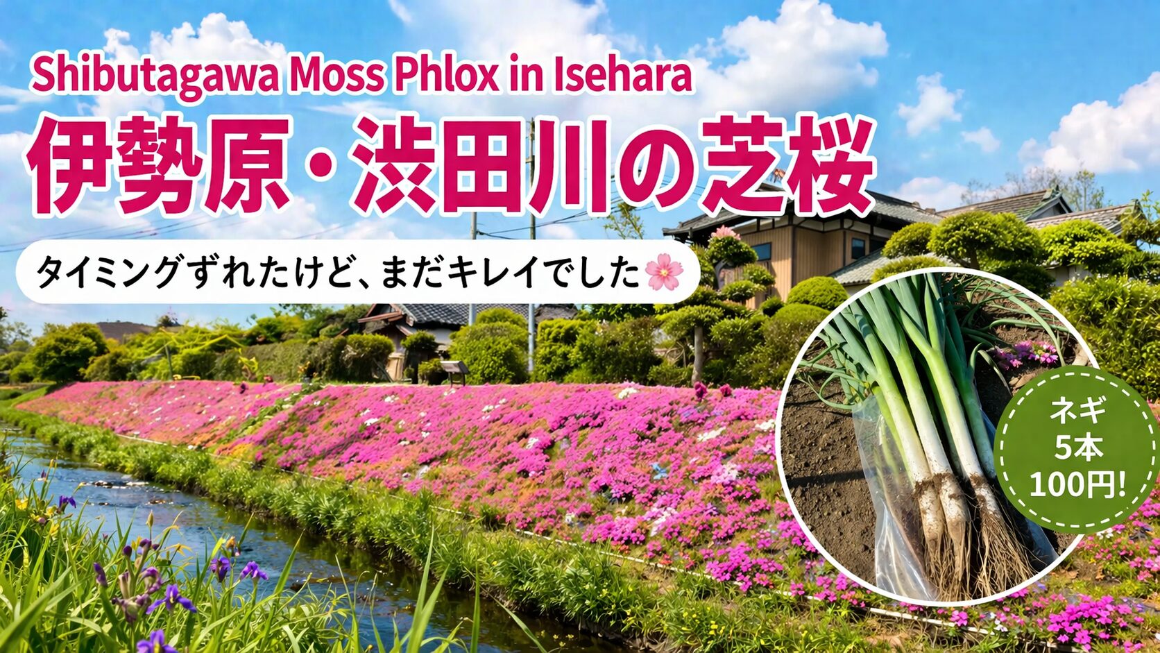 神奈川県伊勢原市・渋田川の芝桜をまつりに行ってきた。混雑なしで楽しめる穴場タイミングや駐車場情報、川沿い散策の様子、まさかの激安ネギ情報までリアル体験で紹介!