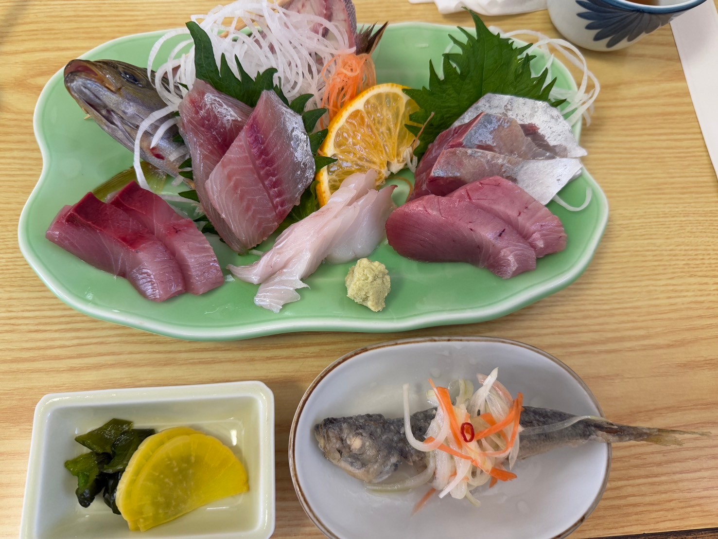 This is the sashimi set meal, which comes with marinated fried horse mackerel (Nanbanzuke).