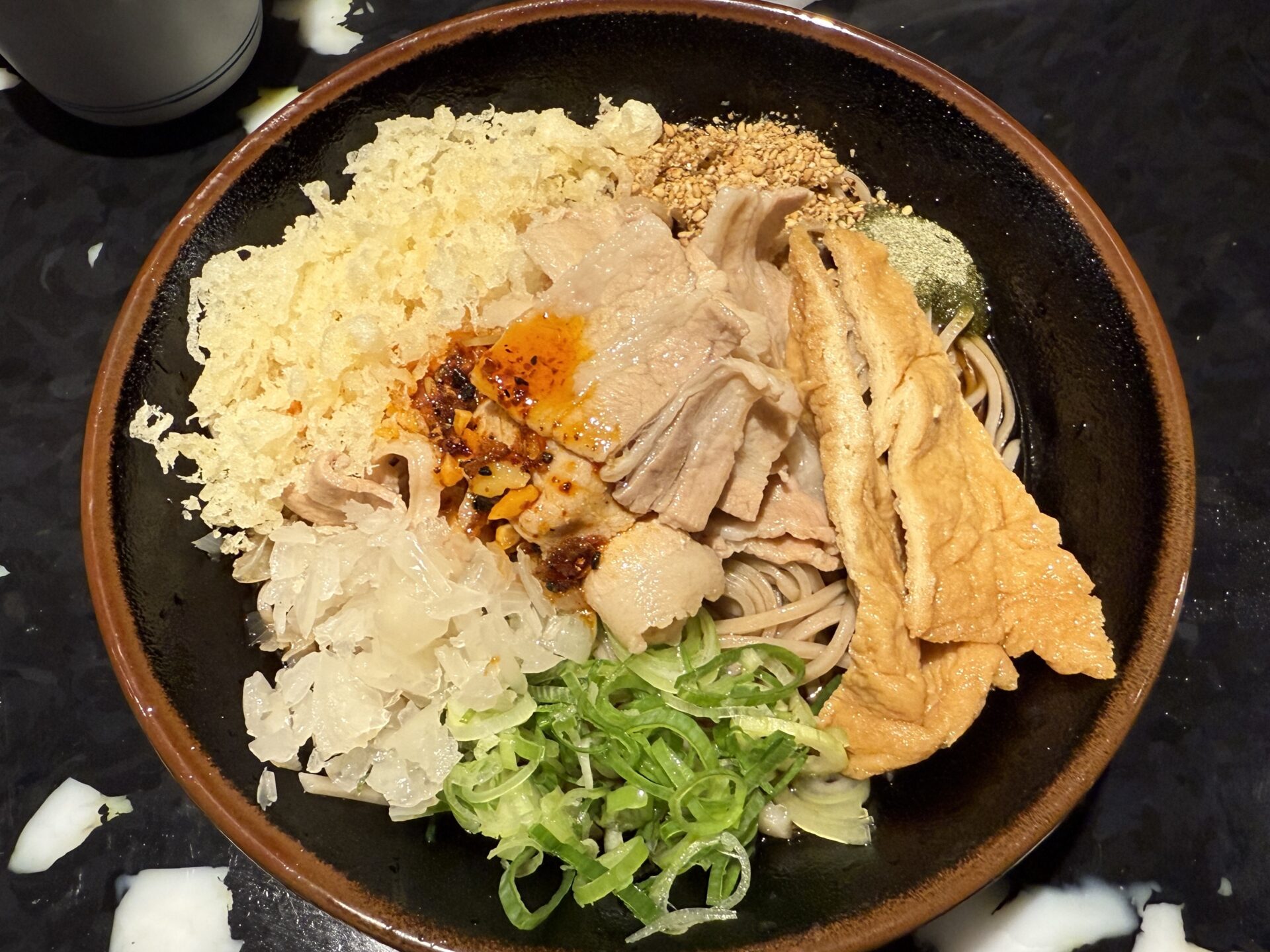 I went for the upgraded version: “Chilled Tanuki Meat Soba.”