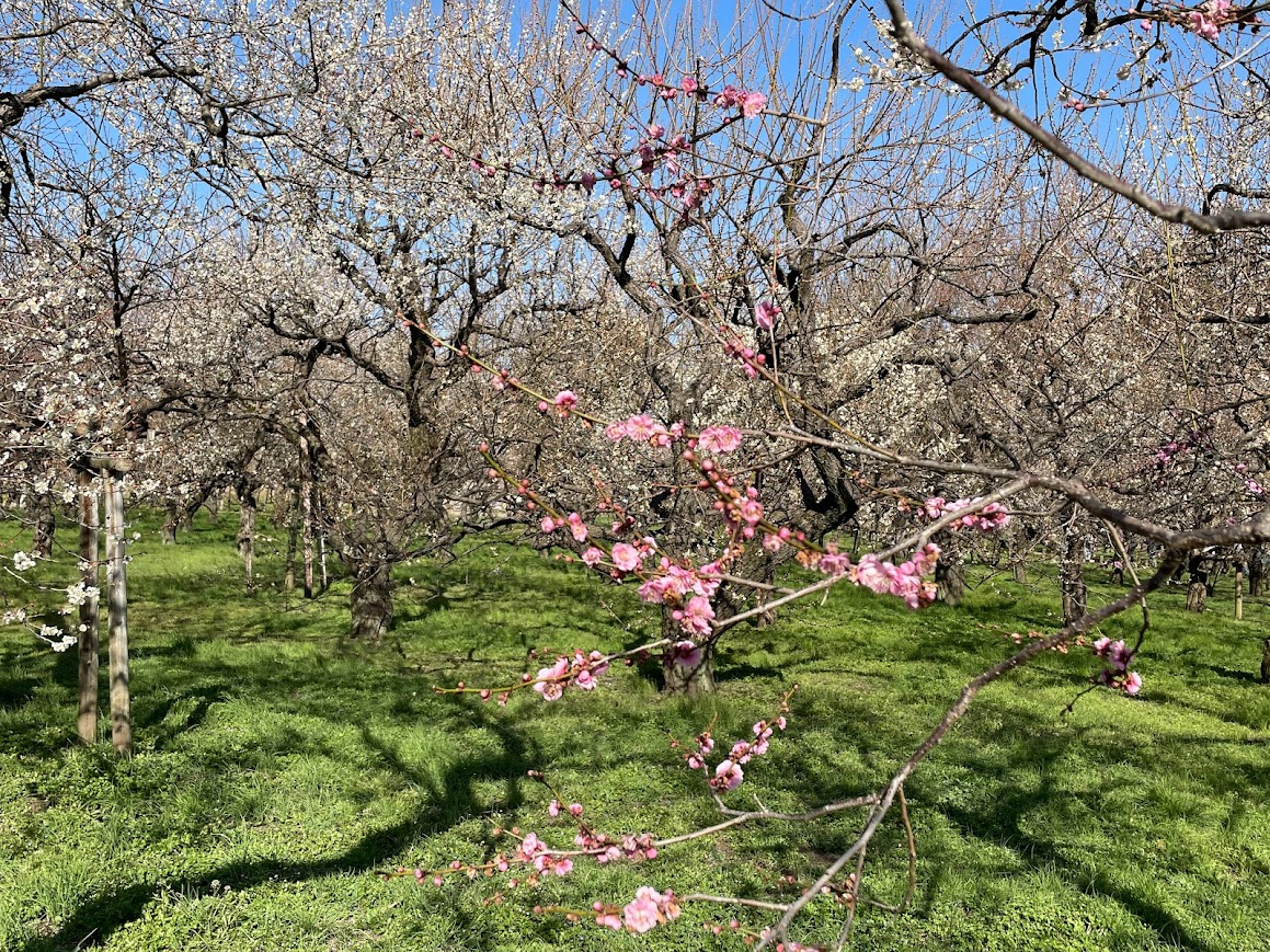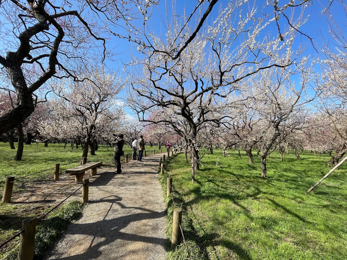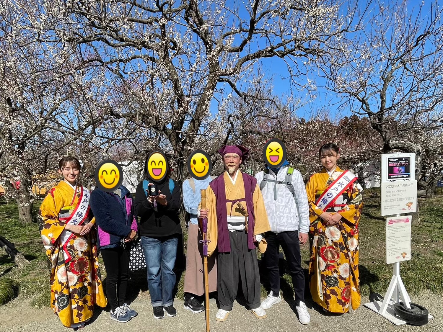 The vibrant kimono of the Plum Blossom Ambassador, the fully bloomed plum trees, and the clear blue sky created a stunning contrast, like a scene from a painting. It was a truly special experience unique to this season!