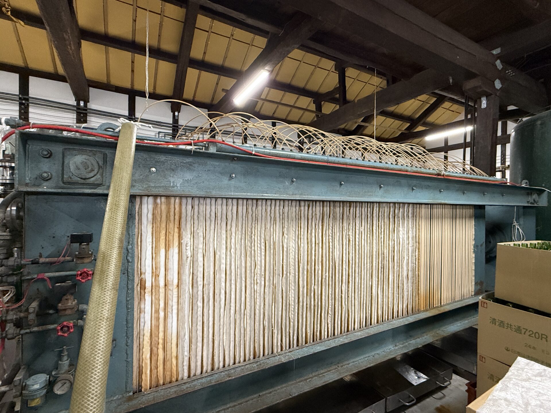We also got to see the filter-style machine used to separate the sake from the lees. The sake kasu (lees) collects between the folds—pretty cool to see how it works!