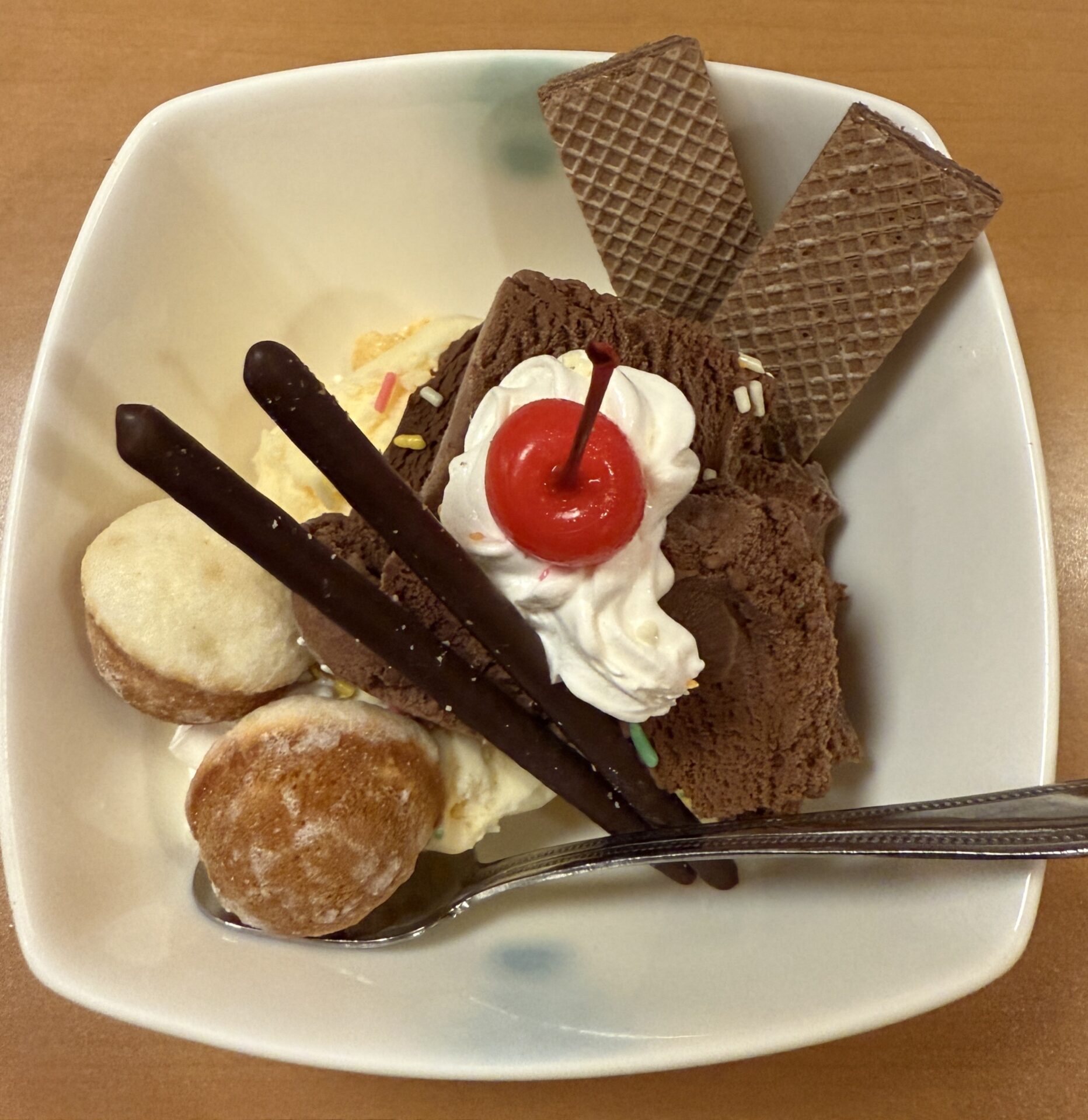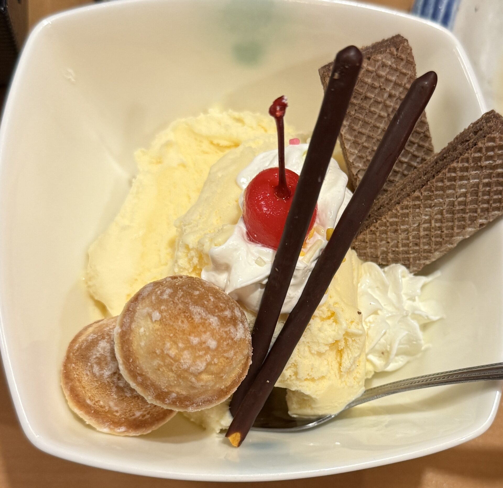 And this was surprisingly huge—topped with Pocky, wafers, for some reason a castella ball, and a cherry, giving it a totally retro Showa-era vibe. Even though we were stuffed, we somehow managed to finish it!