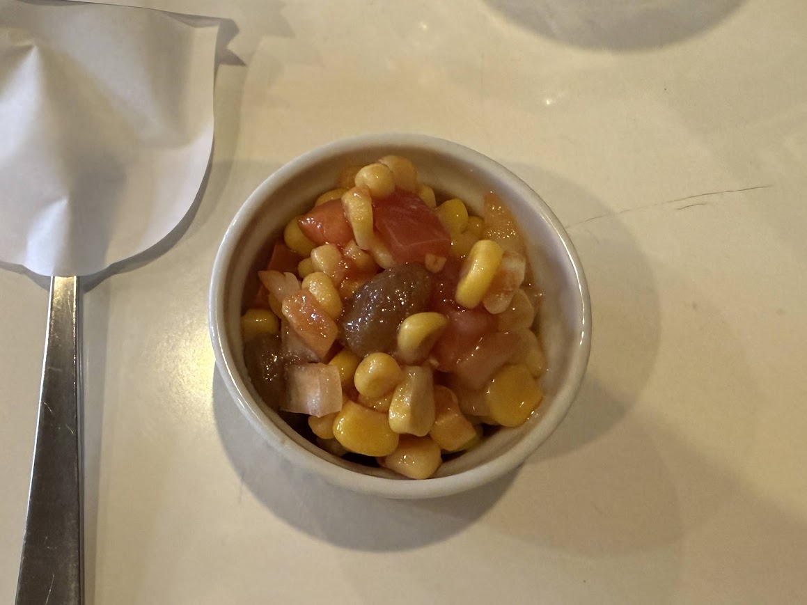 福神漬けの代わりのサラダですと登場したのは、レーズンとコーン、トマトの甘めサラダ。 これが意外とカレーの辛さリセットにぴったりで、箸休めに最高。