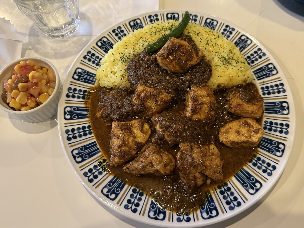 続いて、チキンカレー(普通盛・辛さ普通)。 こちらは胸肉がゴロゴロ入っていて、ルーの中に青唐辛子が!これを潰すと辛さがアップする仕組み。いざ潰してみると…目と鼻に染みるほどの刺激が空気中に拡散!むやみにかぶりつくのは危険です(笑)。