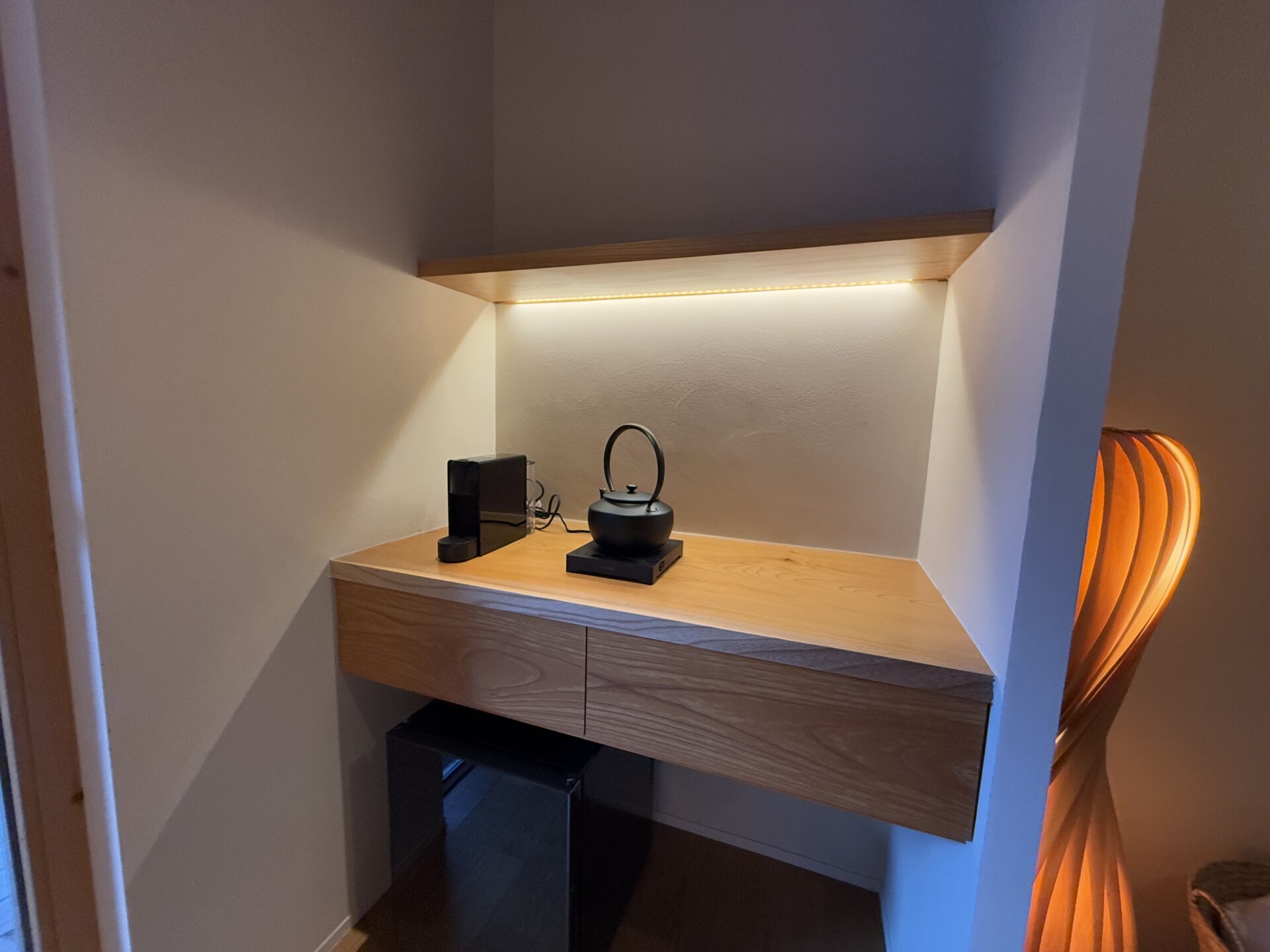 冷蔵庫、コーヒーマシン、鉄瓶のような電気ポットが並ぶコーナー。