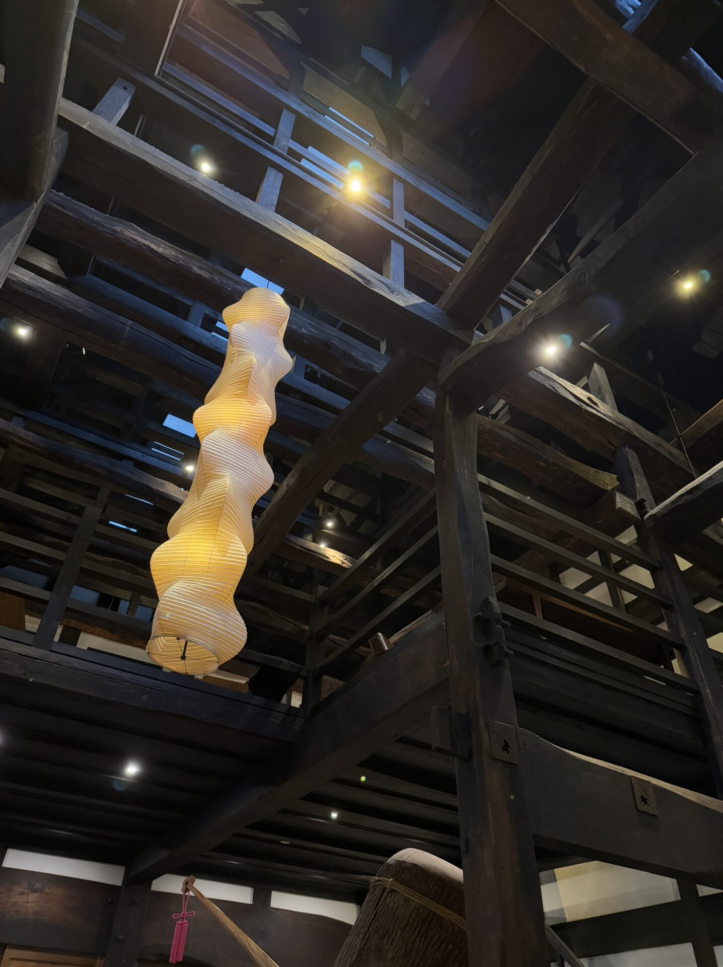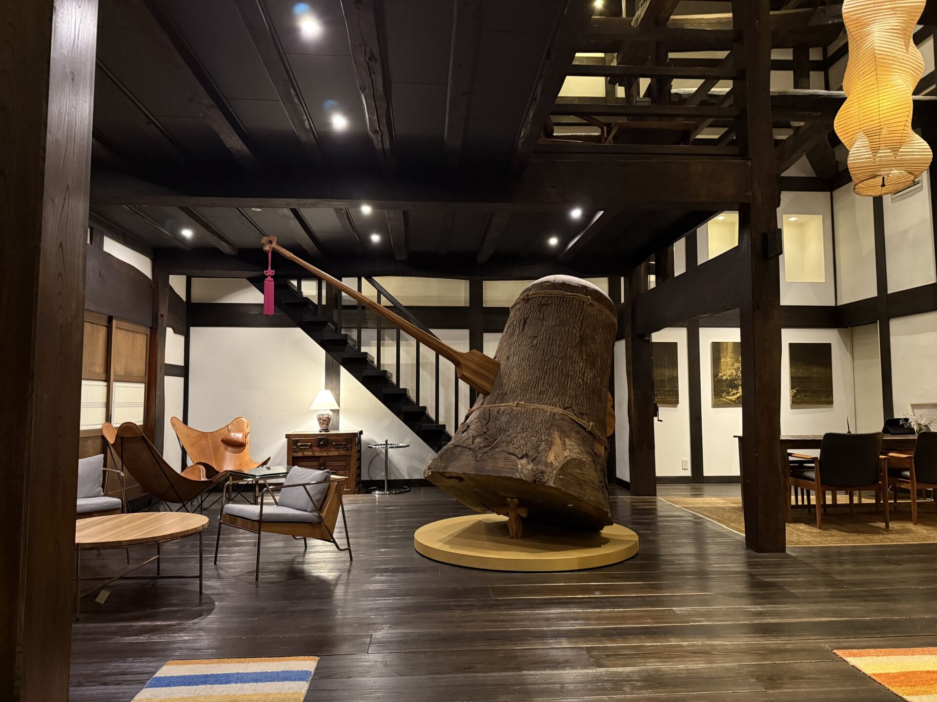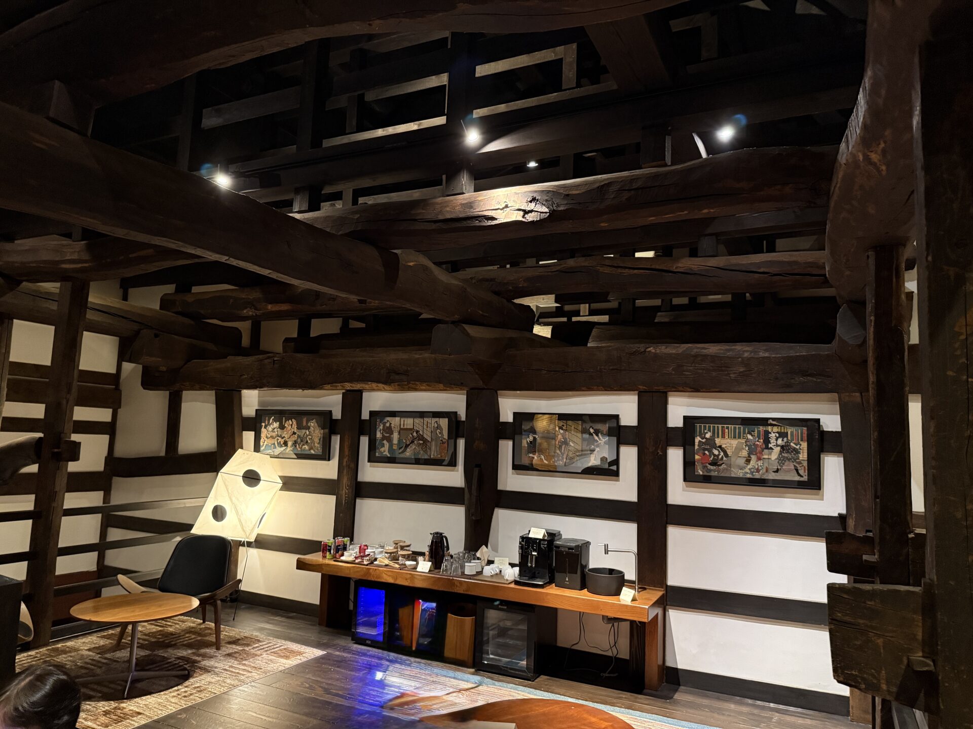 ラウンジは2か所、梁が見事な中二階と、売店側にあります。 こちらが古民家を全力で感じられる中二階ラウンジ!