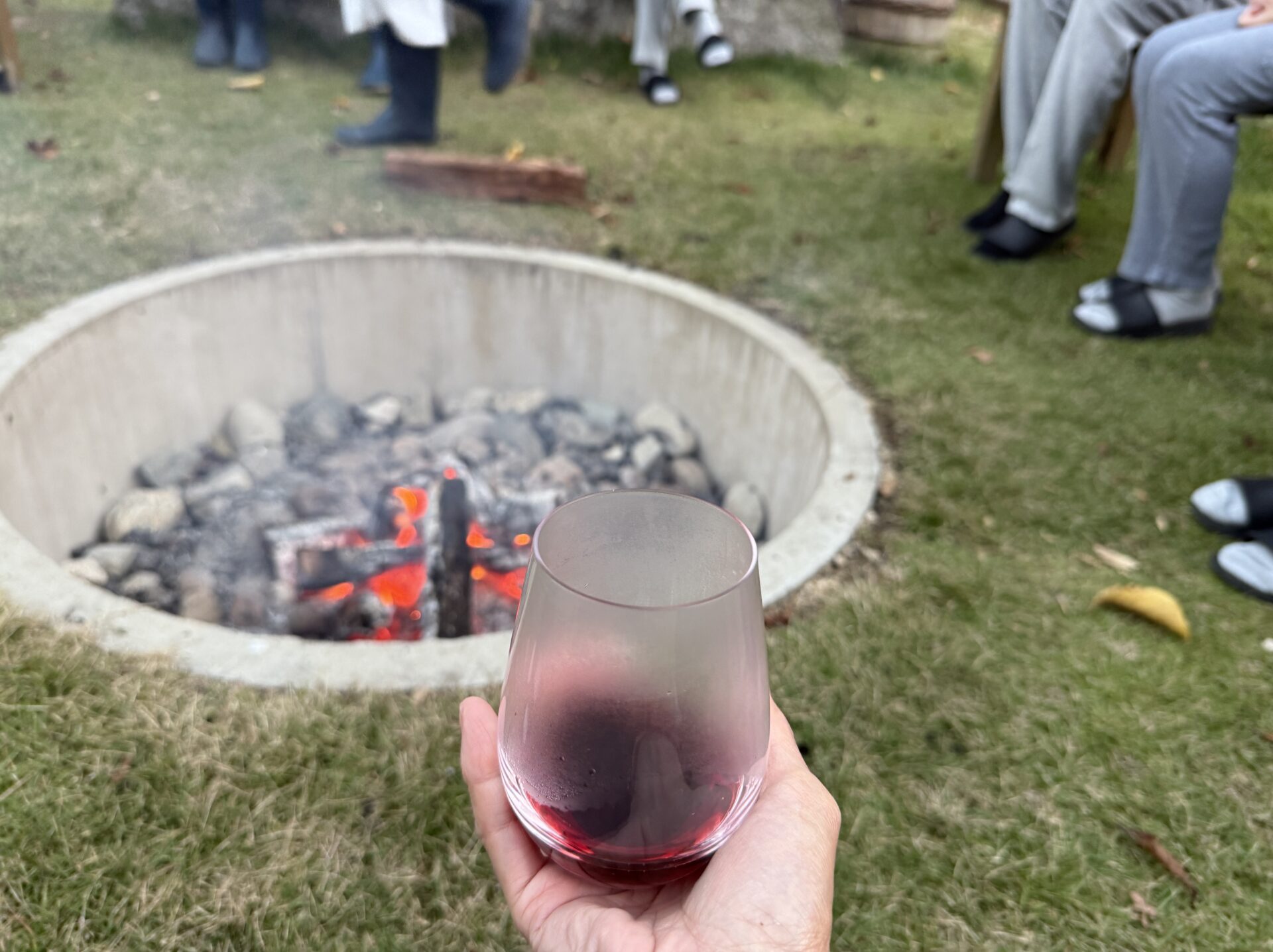 説明のあとは焚火スペースで温まりながらホットワインで乾杯。