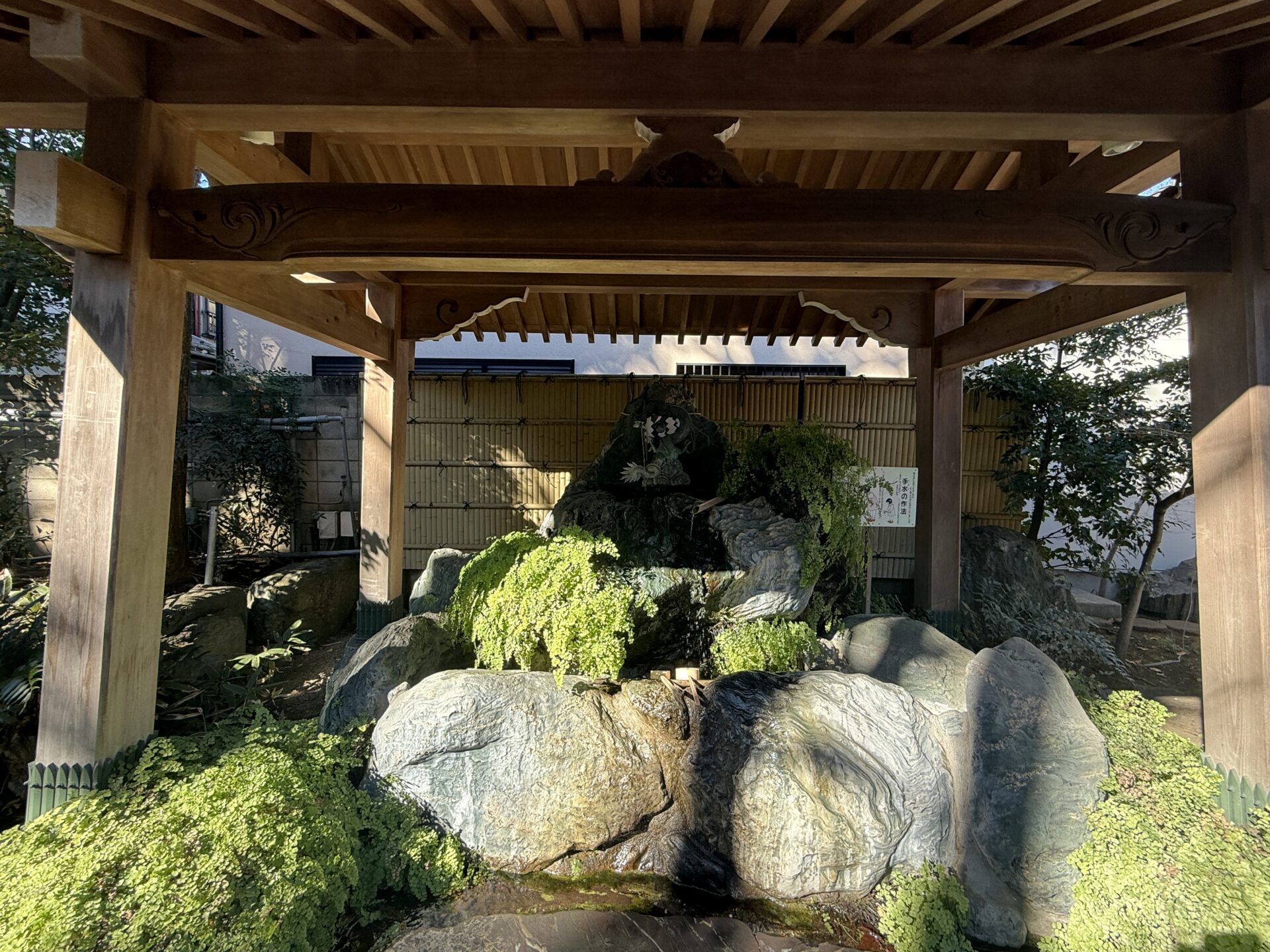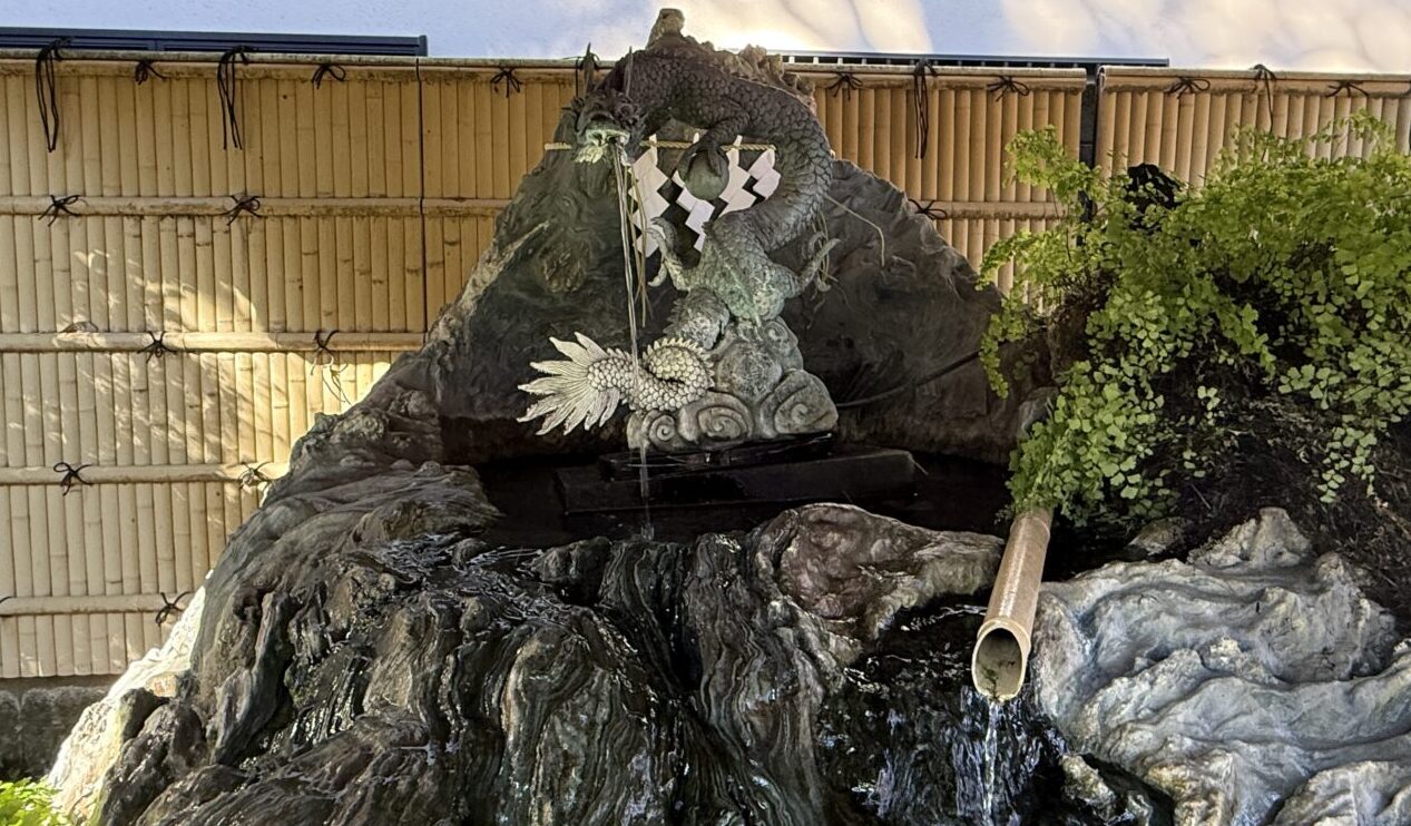 手水舎は逆光、でも主役は龍