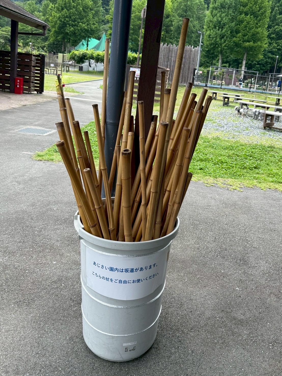 「あじさい園内は坂道があります」と書かれた案内と共に、なんと自由に使える竹の杖がずらり!